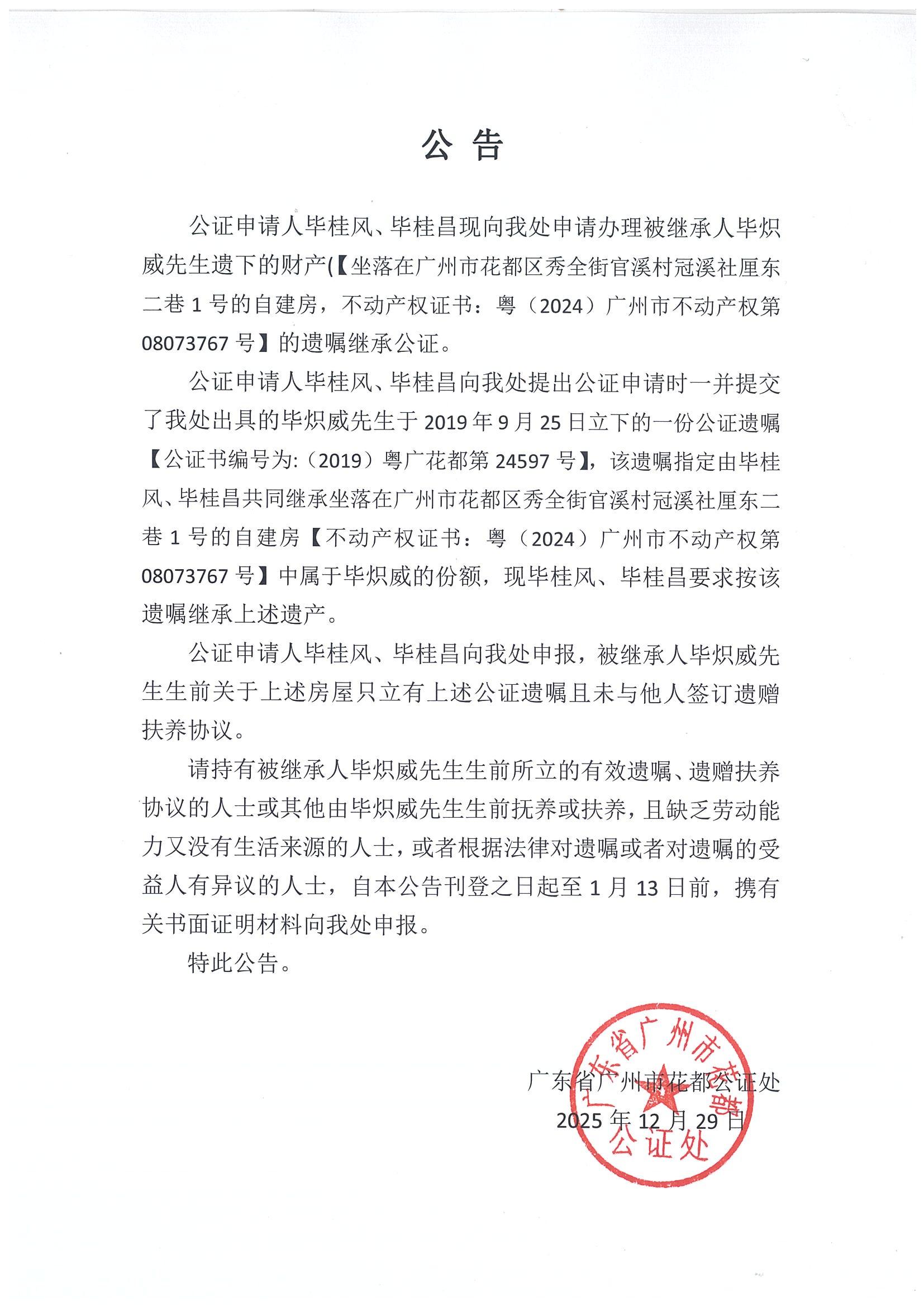 关于毕桂风、毕桂昌申请办理被继承人毕炽威先生遗下财产公证的公告
